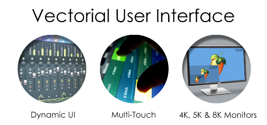 FL Studio 12 wprowadza największą zmianę w interfejsie użytkownika od ponad 10 lat. Monitory wysokiej rozdzielczości stają się powszechne, modele 4K (3840×2160, 4096×2160) i 5K (5120×2880) zalewają rynek osiągając coraz niższe ceny. FL Studio jest w stanie w pełni wykorzystać te wysokie rozdzielczości dzięki idealnie ostremu skalowanemu interfejsie użytkownika. Skalowanie interfejsu może być regulowane przez użytkownika w zakresie od 100% do 400%, więc może wykorzystać nawet monitory o rozdzielczości 8K (7680×4320, 8192×5120), mające szesnaście razy więcej pikseli niż monitory 1080p. Mikser wykorzystuje zalety wektorowego interfejsu gwarantując w pełni dynamiczną obsługę. Kliknięcie na krawędź okna miksera i przesunięcie myszy powoduje zmianę rozmiaru okna. W połączeniu z sześcioma layoutami i funkcjami, które dynamicznie dostosowują się do pionowego zoom, nowy mikser FL Studio 12 jest gotowy do każdego zadania.